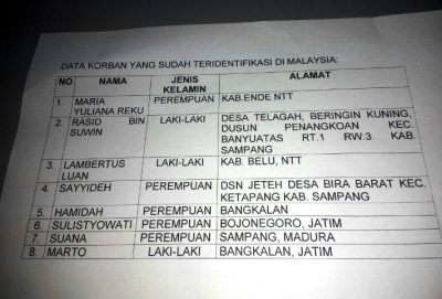 Data korban yang sudah teridentifikasi di Rumah Sakit Mersing, Johor Malaysia;