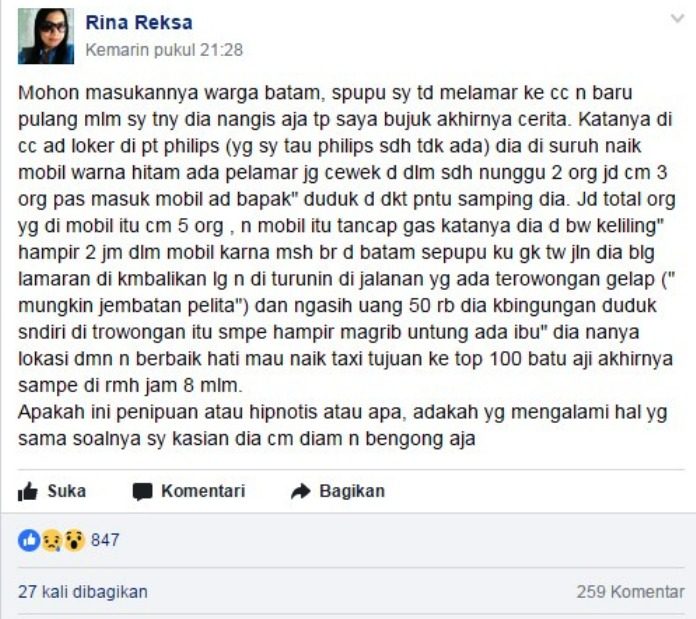 Di mana Rina Reksa menjelaskan dipostingannya, bahwa sepupunya melamar pekerjaan di suatu perusahaan, tapi pulang dari melamar sampai malam hari. Pada saat Rina Reksa menyakannya kepada sepupunya. Sepupunya ini menangis aja, akhirnya dibujuk-bujuk oleh Rina, diceritakan sepupunya bahwa dia melamar di perusahaan yang menurut Rina sudah tutup.