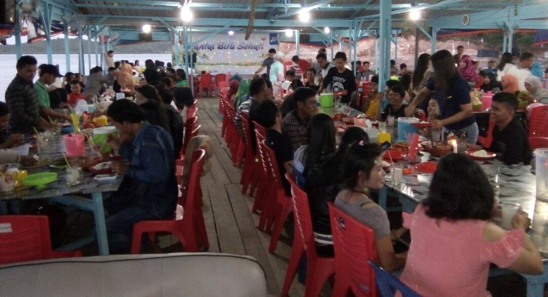 Restoran Pantai Biru Sehati ini cukup femiliar dikalangan anak muda, khusus para karyawan perusahaan muka kuning. Sebelum bersantap, mereka terlebih dahulu menikmati di pinggiran pantai sambil berselfi alias berfoto.