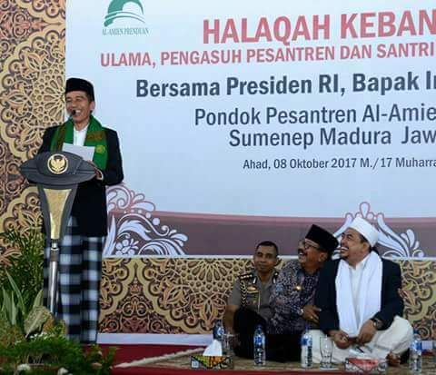 Apresiasi tersebut disampaikan langsung oleh Presiden saat menghadiri Halaqah Kebangsaan Ulama, Pengasuh Pesantren, dan Santri Berprestasi se-Madura di Pondok Pesantren Al Amien Prenduan, Kabupaten Sumenep, Jawa Timur, pada Minggu, 8 Oktober 2017.