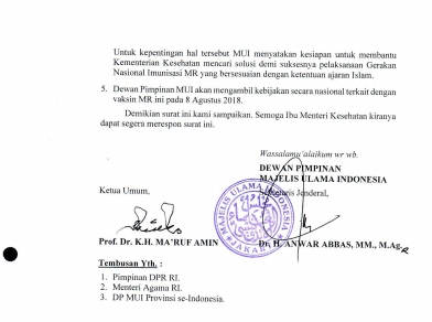 Dikutip dari Batam Clcik, dalam surat itu dijelaskan Berdasarkan Surat Majelis Ulama Indonesia (MUI), nomor: B-904/DP-MUI/VII/2018 tertanggal 12 Dzulqaidah 1439 H /25 Juli 2018 M, Prihal Vaksin MR, menyatakan bahwa MUI membantah telah menyatakan bahwa vaksin MR halal atau boleh digunakan.