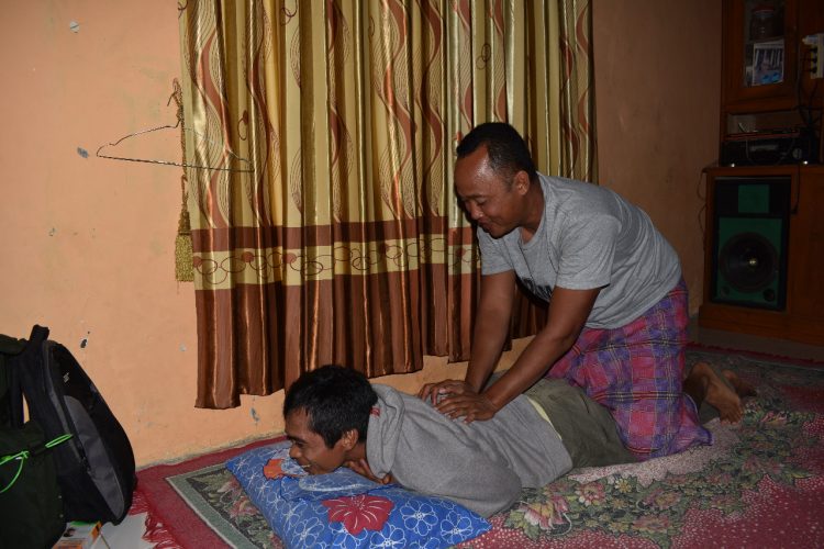 Dilakukan, di sela-sela istirahat malam selesai menunaikan ibadah sholat isya. Serda Ragil anggota satgas bergantian melakukan pijat-memijat dengan Toni (42) petani Dusun Kroya Rt2/Rw3 Desa Pasegeran, Kecamatan Pandanarum.