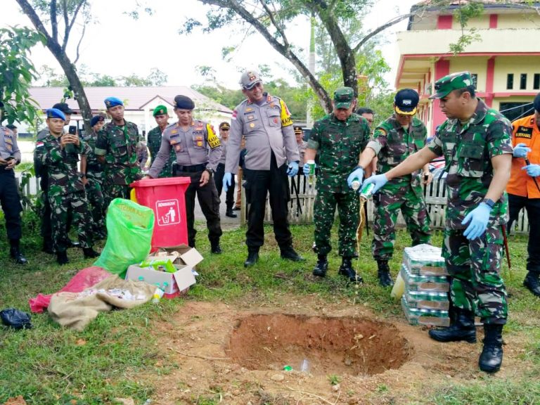 Usai melaksanakan apel gelar pasukan Operasi Ketupat Seligi 2019, Kapolres Natuna AKBP Nugroho Dwi Karyanto bersama unsur FKPD dan Muspida Natuna melakukan pemusnahan barang bukti berupa miras dan makanan kadaluarsa.