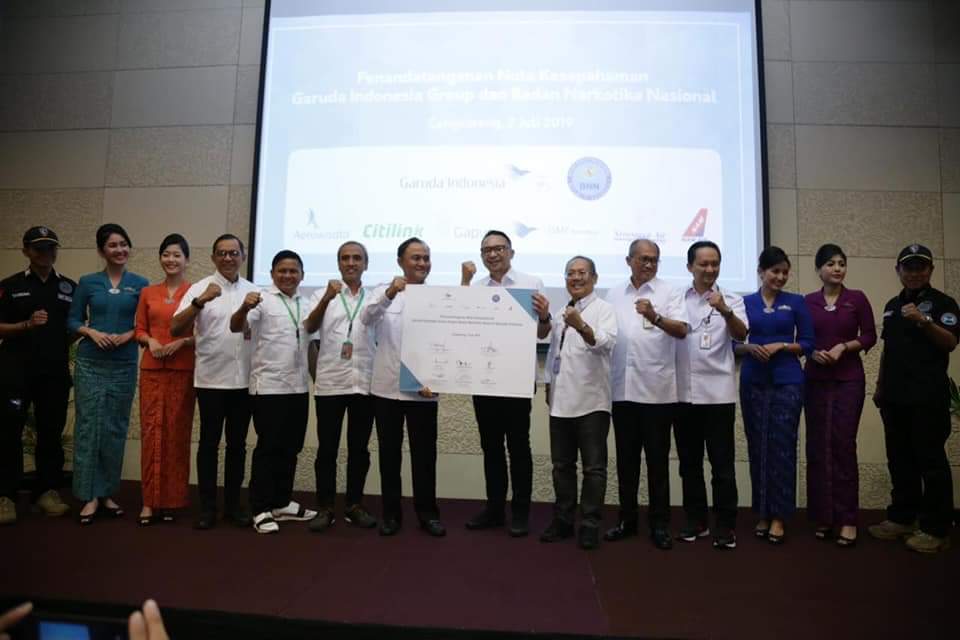 Hal ini diwujudkan dengan penandatanganan Nota Kesepahaman (MoU) antara Badan Narkotika Nasional (BNN) dengan PT Garuda Persero, PT Sriwijaya Air danPT NAM Air, dilakukan pada hari ini, Selasa (2/7/2019) di Auditorium Garuda Management Building.