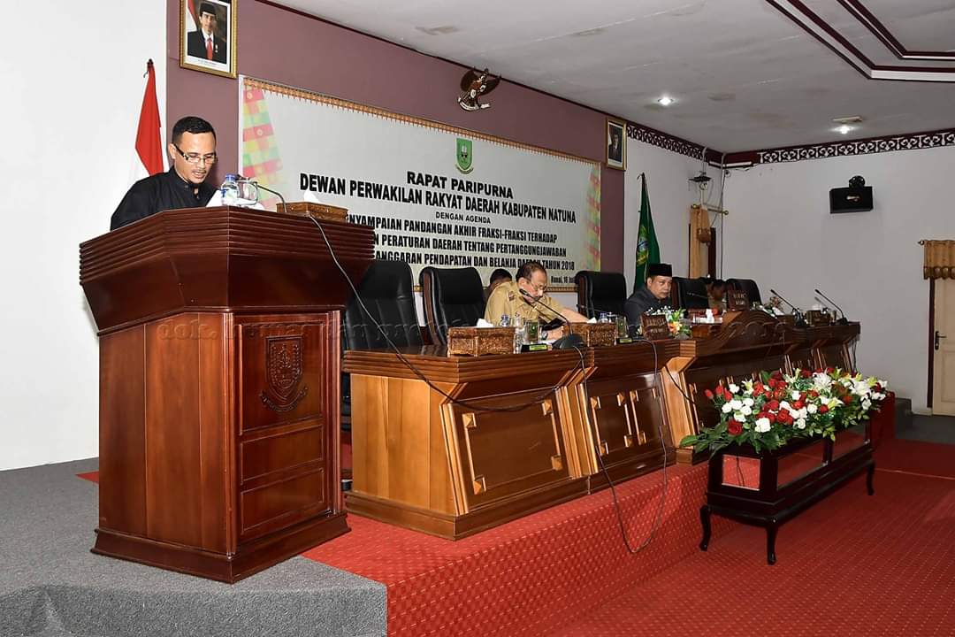 Sejumlah ftaksi DPRD penyampaian pandangan akhir fraksi-fraksi terhadap Rancangan Peraturan Daerah tentang Pertanggungjawaban Pelaksanaan Anggaran Pendapatan Belanja Daerah tahun 2018 bertempat di Kantor DPRD Kabupaten Natuna Ranai (16/07) selasa pagi.