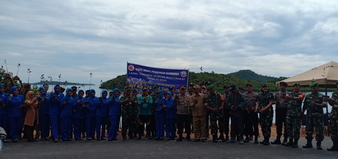 WARTAKEPRI.co.id, ANAMBAS – Dalam rangka memperingati Hari Ulang Tahun TNI ke – 74 Tahun 2019, Danlanal Tarempa Letkol Laut (P) Nur Rochmad Ibrohim, ST, M.Si bersama Ketua Jalasenastri Cabang 3 Korcab IV DJA I Ibu Ira Nur Rochmad, S.E menyelenggarakan kegiatan Karya Bhakti dalam bidang Potensi Maritim berupa penanaman Magrove Lanal Tarempa bersama masyarakat Desa Pesisir, Kec. Siantan Timur, Kab. Kepulauan Anambas, Senin (07/10/19).