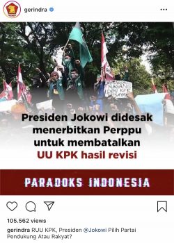 Akun @Gerindra mengunggah video berisi slide-slide desakan publik agar Jokowi menolak RUU KPK. Diunggah juga slide bahwa partai pendukung Joko Widodo-Maruf Amin berada pada posisi mendukung RUU KPK.