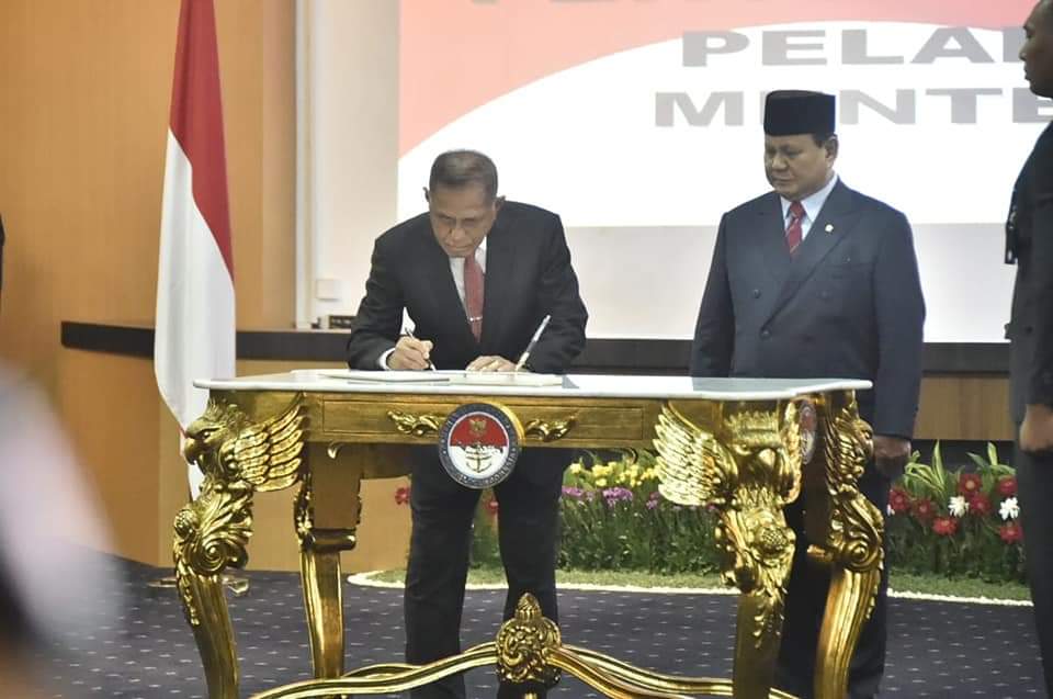 Sertijab Menhan Prabowo berdasarkan Surat Keputusan Presiden Republik Indonesia Nomor 113/P Tahun 2019 tanggal 23 Oktober 2019 tentang Pembentukan Kementerian Negara dan Pengangkatan Menteri Negara Kabinet Indonesia Maju Periode Tahun 2019-2024.