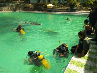 Para peserta latihan selam dasar diajari renang gaya bebas, pengenalan peralatan selam, snorkling serta langsung praktek menyelam menggunakan alat selam.