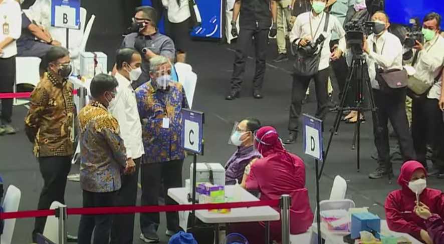 Kepala Negara dengan didampingi oleh Menteri Kesehatan Budi Gunadi Sadikin, Menteri Komunikasi dan Informatika Johnny G. Plate, dan Ketua Dewan Pers Mohammad Nuh langsung memantau jalannya proses vaksinasi setibanya di lokasi sekira pukul 09.10 WIB.