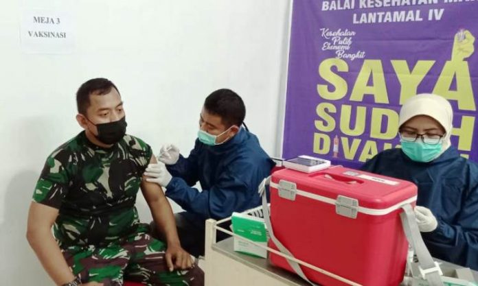WARTAKEPRI.co.id, TANJUNGPINANG – Prajurit pangkalan utama TNI angkatan laut IV (Lantamal IV) Tanjungpinang laksanakan vaksin covid-19 astrazaneca tahap I termin I dilaksanakan di Kantor Dinas Kesehatan Lantamal IV (Diskes Lantamal IV) Jl. S.M. Amin Tanjungpinang Kepri, Selasa (30/3/2021) pagi.