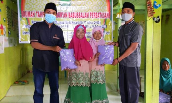 Penyerahan pakaian seragam kepada para santri langsung dibagikan oleh Hettiandri.SH.MH selaku Ketua Pengelola Rumah Tahfiz Al Qur’an Babussalam Perbatasan yang berada di Kabupaten Kepulauan Anambas.