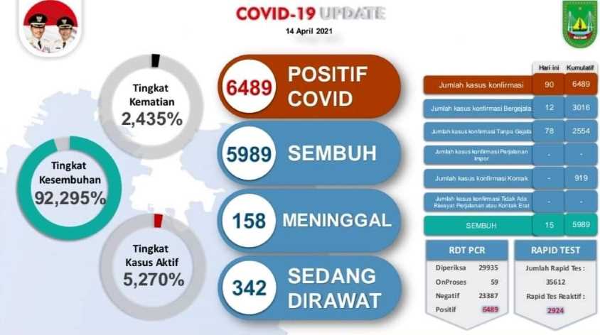 Kepala Dinas Komunikasi dan Informatika Kota Batam, Azril Apriansyah mengatakan laporan Tim Satgas Pengawasan Covid-19 pada 14 April 2021 terdapat penambahan 90 kasus positif baru. Sedangkan untuk yang sembuh sebanyak 15 orang.