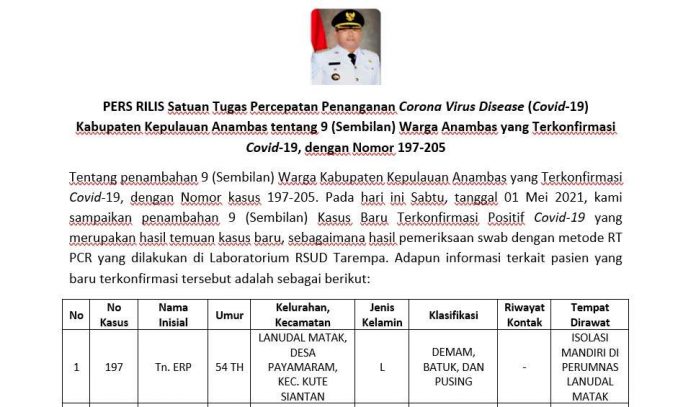 WARTAKEPRI.co.id, ANAMBAS – Satuan Tugas Percepatan Penanganan Corona Virus Disease (Covid-19) Kabupaten Kepulauan Anambas menerangkan tentang 9 (Sembilan) Warga Anambas yang Terkonfirmasi Covid-19, dengan Nomor 197-205. Kasus pada Sabtu, tanggal 01 Mei 2021 merupakan hasil temuan kasus baru. Sebagaimana hasil pemeriksaan swab dengan metode RT PCR yang dilakukan di Laboratorium RSUD Tarempa. Adapun informasi terkait pasien yang baru terkonfirmasi tersebut adalah sebagai berikut: