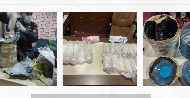 Hasil pemeriksaan barang, petugas mendapati bungkusan mencurigakan dalam galon plastik yang disembunyikan dalam keranjang bambu.