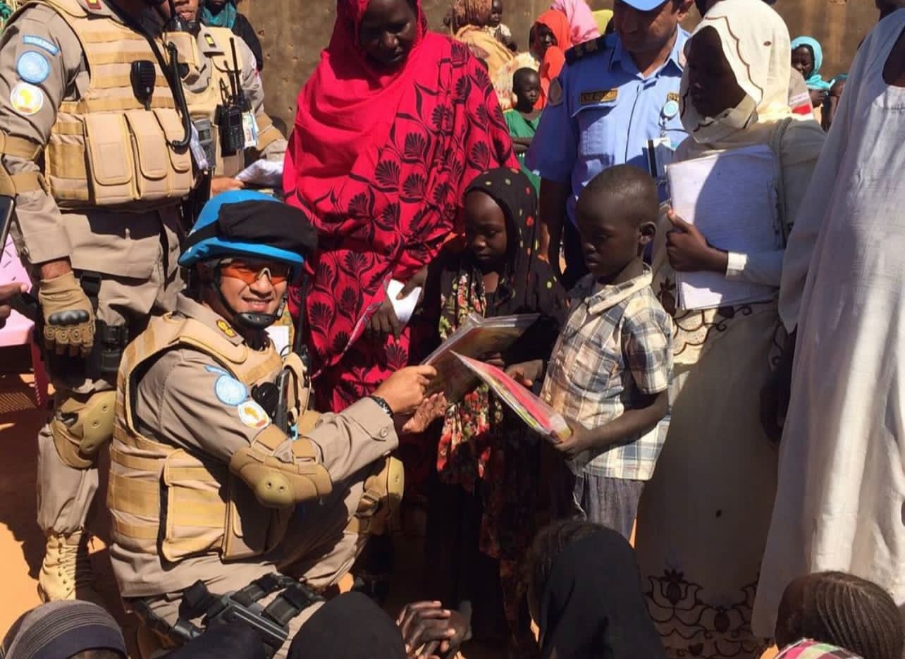 “Saya pernah menjadi Kasatgas FPU, saat itu FPU VII (7), pada misi Unamid di Darfur Sudan. Itu di tahun 2014-2015. Banyak hal yang kami lakukan disana, selain ketiga tugas utama FPU. Kami juga melakukan kegiatan kemanusiaan, salah satunya memberikan bantuan buku dan alat tulis untuk kebutuhan sekolah anak-anak disana,” ceritanya.