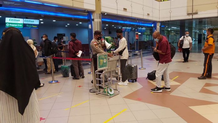 Kapolresta Barelang KBP Yos Guntur, SH, SIK, MH melalui Kapolsek Kawasan Bandara AKP Cut Putri Amelia Sari, SIK mengatakan mengantisipasi dijumpai calon penumpang “nakal” yang tidak mau menjaga jarak karena alasan buru-buru.