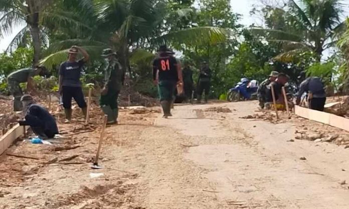 WARTAKEPRI.co.id, BATAM – Pekerjaan pemasangan mal atau papan cor untuk pengecoran jalan dikerjakan oleh personil TNI dan masyarakat dalam program TMMD ke-112 Kodim 0316/Batam di Kampung Teluk Air, Kelurahan Setokok, Kecamatan Bulang, Minggu (03/10/2021).