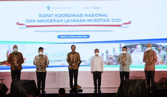 Di samping itu, Presiden mengapresiasi pemerintah provinsi dan daerah yang telah mendapatkan penghargaan untuk investasi, baik realisasi investasi, maupun urusan perizinan.