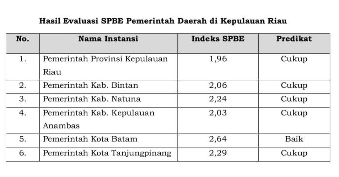 WARTAKEPRI.co.id, BATAM – Kota Batam satu-satunya daerah di Kepri yang mendapatkan predikat baik dalam hasil evaluasi Sistem Pemerintahan Berbasis Elektronik (SPBE).