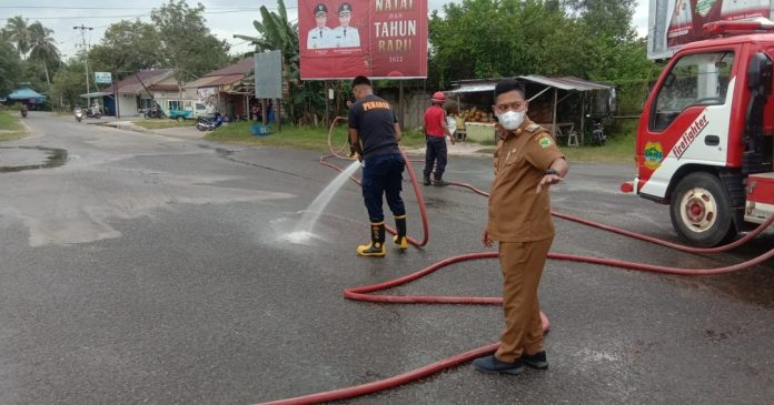 WARTAKEPRI.co.id, LINGGA – Warga seputaran Kota Dabo sempat terheran melihat Wakil Bupati Lingga Neko Wesha Pawelloy, secara tiba-tiba pada petang Senin (10/1/2022), membawa beberapa petugas pemadam kebakaran (Damkar) dan Satuan Polisi Pamong Praja (Satpol PP) Lingga untuk menyemprot beberapa ruas jalan yang berpasir untuk menjamin keselamatan pengguna jalan karena pasir tersebut membahayakan pengguna jalan.