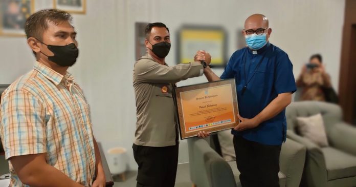 Penghargaan diserahkan langsung oleh Romo Paschal sebagai Pastor Ketua Komisi Keadilan Perdamaian Pastoral Migran dan Perantau (KKPPMP) Kepri kepada Kompol Yudha di Mapolsek Sekupang.