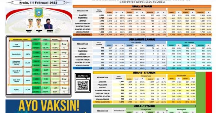 WARTAKEPRI.co.id, ANAMBAS – Satuan Tugas (Satgas) Penanganan Covid-19 dan Pemulihan Ekonomi Kabupaten Kepulauan Anambas merilis capaian vaksinasi di Kabupaten Kepulauan Anambas terhitung tanggal 14 Februari 2022.