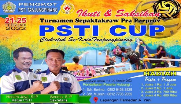 WARTAKEPRI.co.id, TANJUNGPINANG – Pengurus Kota Persatuan Sepak Takraw Indonesia (Pengkot PSTI) Tanjungpinang akan menggelar turnamen PSTI Cup di Lapangan Pamedan pada 21-25 Februari 2022 mendatang.