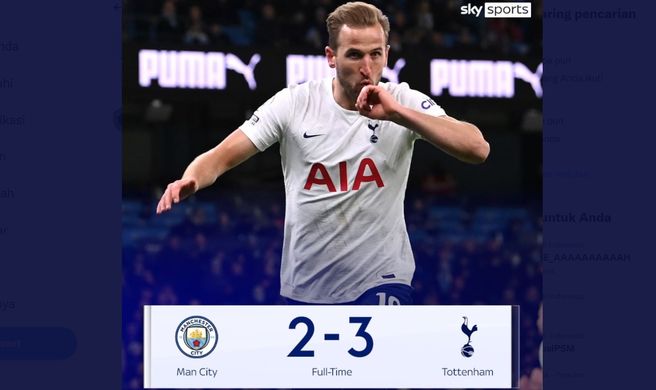 WARTAKEPRI.co.id – Kekalahan dramatis Manchester City 2-3 dari Tottenham Hotspur pada pekan ke-26 Liga Inggris di Stadion Etihad, Sabtu (19/2/2022), membuka peluang Liverpool menjadi juara Liga Inggris musim ini. Man City menelan kekalahan dramatis dari Tottenham. Gol di masa injury time yang dicetak Harry Kane membuat Man City kalah 2-3 dari Tottenham.