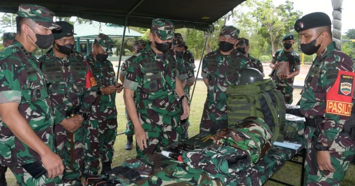 Usai paparan Danyon, Asops Panglima TNI bersama rombongan melakukan pemeriksaan kesiapan pasukan meliputi kesiapan personel maupun materiil di lapangan hijau batalyon tersebut.