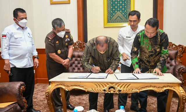 WARTAKEPRI.co.id, TANJUNGPINANG – Gubernur Kepulauan Riau H. Ansar Ahmad melibatkan Kejaksaan Tinggi Kepri dalam proses pengerjaan pedestarian dan penataan median jalan bandara Raja Haji Fisabilillah Kota Tanjungpinang. Gubernur Ansar dan Kejati Kepri Gerry Yasid secara langsung menyaksikan penandatanganan kontrak pengerjaan proyek tersebut di Gedung Daerah, Tanjungpinang, Rabu (16/03/2022).