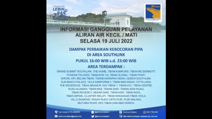 Area terdampak : Grand Summit Southlink, The Home, Tiban Kampung, Tiban Mc.Dermott, Pondok Pelangi, Tiban BTN 1-6, Tiban Global, Sirion, GPI, Belian Tiban, Taman Harapan Indah, Queen Southlink, Sun Beach Palace, Villa Sampurna 1, Tiban Mas Indah, Cipta Land, Tiban Point, The Residence, Tiban Makmur, Kav Tiban 1, Tiban Ayu, Tiban Centre, Ruko Alamiah, Tiban Mas, Taman Sari.