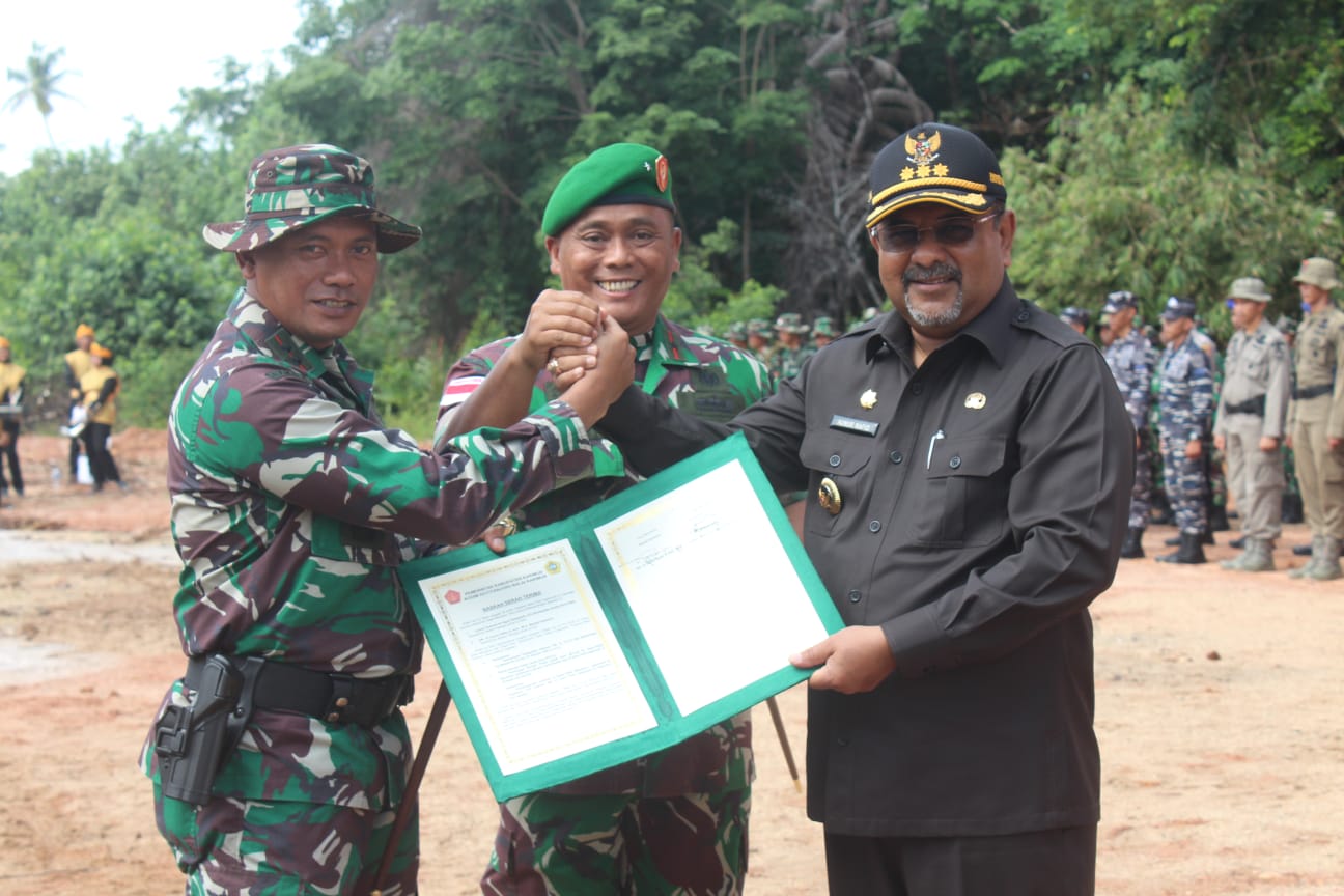Penandatanganan sekaligus penyerahan naskah serah terima hasil kegiatan TNI Manunggal Membangun Desa, dari Dansatgas Kepada Bupati Karimun disaksikan oleh Inspektur upacara.