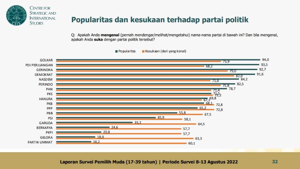 Berdasarkan temuan survei CSIS, tingkat popularitas partai berlambang pohon beringin (Golkar) lebih tinggi dibanding PDIP (93,5 persen), Gerindra (92.7 persen), dan Demokrat (91,6 persen).