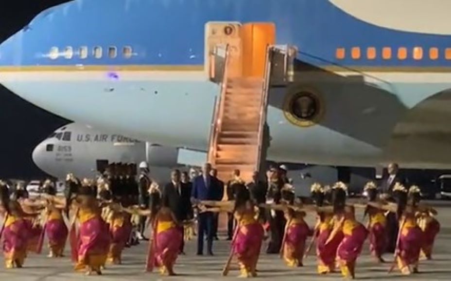 Kedatangan Biden disambut dengan pasukan jajar kehormatan dan penampilan puluhan penari Bali. Biden tampak tersenyum melihat sambutan para penari tersebut.