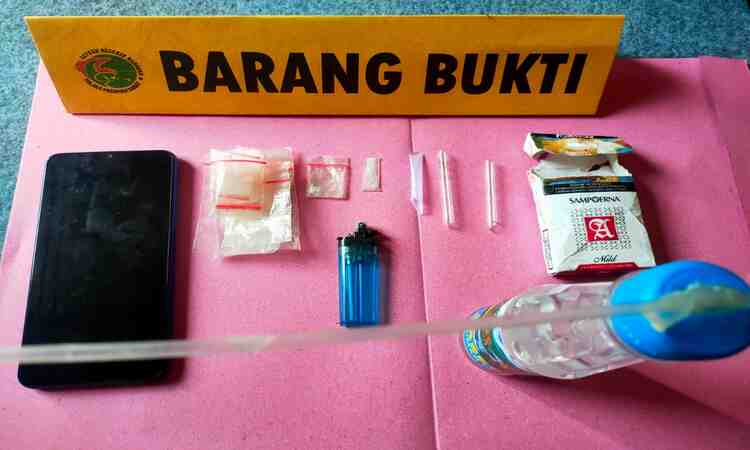 Dari tersangka, petugas menemukan dan menyita barang bukti berupa, satu buah kotak rokok Sampoerna mild yang didalamnya terdapat satu paket ukuran kecil yang diduga berisi Narkotika jenis Shabu yang dibungkus dengan plastik warna bening, dua buah kaca pirek, satu buah paket ukuran kecil yang diduga Narkotika jenis sabu yang dibungkus dengan plastik warna bening, tujuh belas plastik klip warna bening yang diduga untuk membungkus shabu, satu buah manchis warna biru, satu set bong yang terbuat dari botol air mineral, serta satu unit handphone merek Vivo warna hitam.