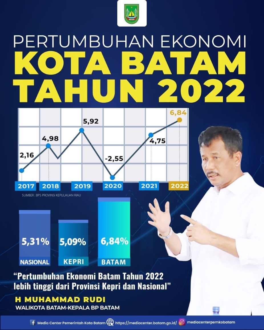 Sebelumnya, pada 2021, pertumbuhan ekonomi Batam di angka 4,75 persen dan di 2020 di angka -2,55 persen. Pertumbuhan ekonomi Kota Batam pun paling mencolok pada 2022, di mana Batam sukses menjadi daerah tertinggi pertumbuhan ekonomi dibandingkan daerah lain di Kepri.
