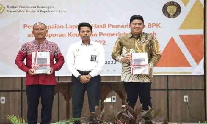 WARTAKEPRI.co.id, BINTAN – Bupati Bintan Roby Kurniawan menerima Laporan Hasil Pemeriksaan (LHP) atas Laporan Keuangan Pemerintah Daerah (LKPD) Tahun Anggaran 2022. LHP diserahkan langsung oleh Kepala Perwakilan Badan Pemeriksa Keuangan Provinsi Kepulauan Riau Jariyatna di Auditorium Kantor BPK Kepri, Rabu (12/04).