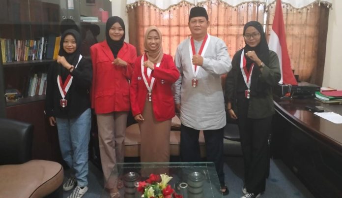Pengalungan Gordon GMNI oleh Ketua DPC GMNI Cabang Karimun Ria Pazira, kepada Plt Rektor Universitas Karimun Muhiri S.Pd., M.Pd.(Foto: Istimewa)