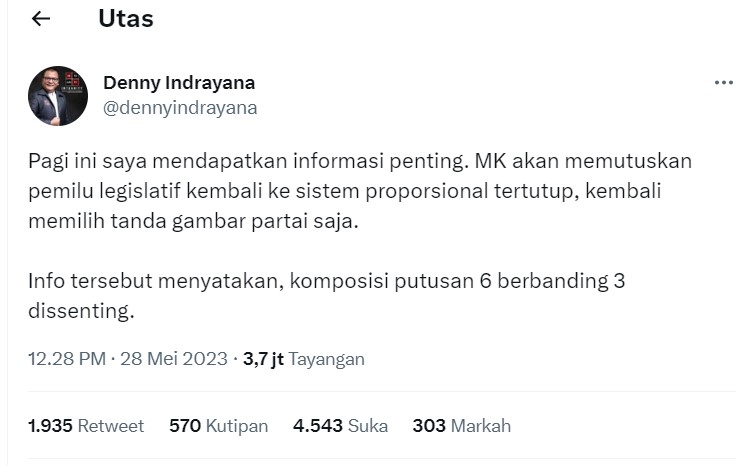 “Info tersebut menyatakan, komposisi putusan 6 berbanding 3 dissenting,” kata dia. Dengan sistem proporsional tertutup ini, kata Denny, Pemilu 2024 akan terasa kembali seperti Orde Baru yang otoriter dan koruptif.