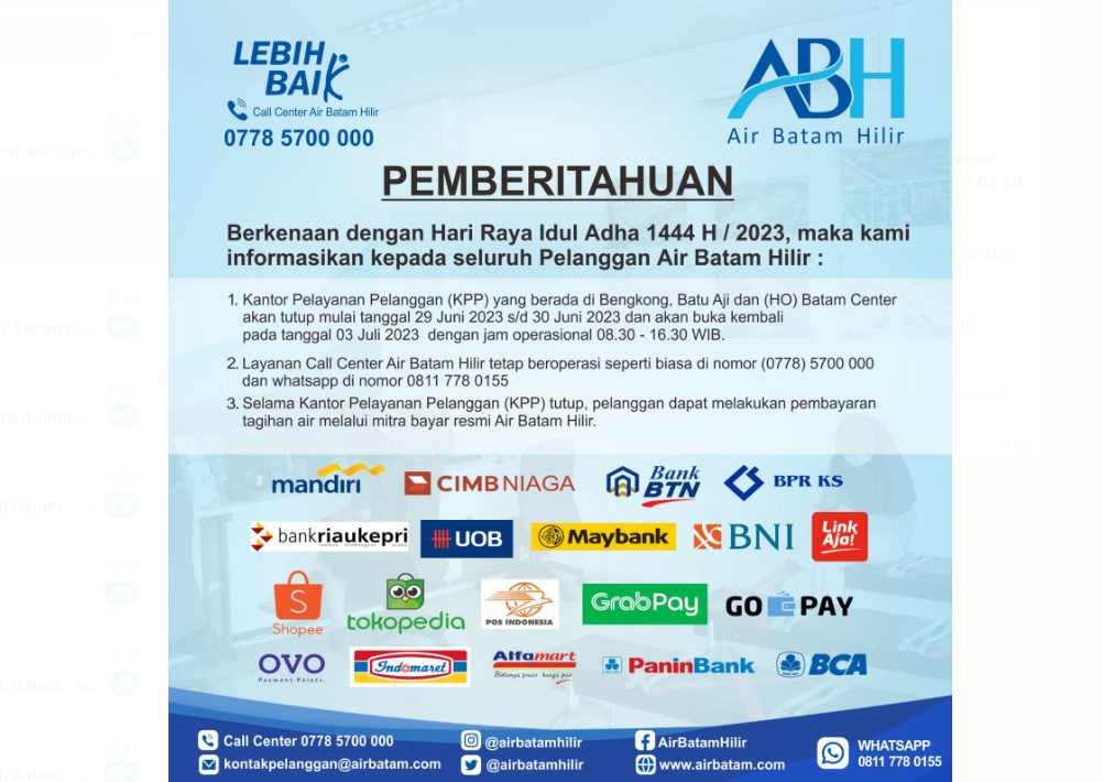 Sehubungan dengan libur Lebaran Hari Raya Idul Adha 1444 H, tahun 2023. Maka manajeman Air Batam Hilir menginformasikan sebagai berikut: