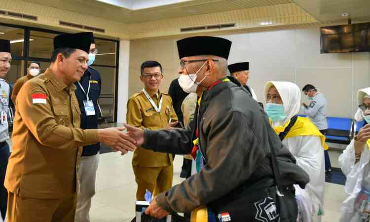 “Assalamualikum bapak dan ibu jamaah haji semua, selamat datang kembali di tanah air. Semoga ibadah haji yang telah dilaksanakan ini, membawa bapak dan ibu semua, menjadi haji yang mabrur,” ucap Gubernur Ansar sambil menyalami para jamaah.
