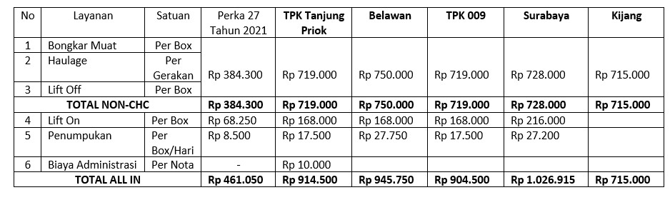 Berikut perbandingan tarif bongkar muat di pelabuhan sejenis :