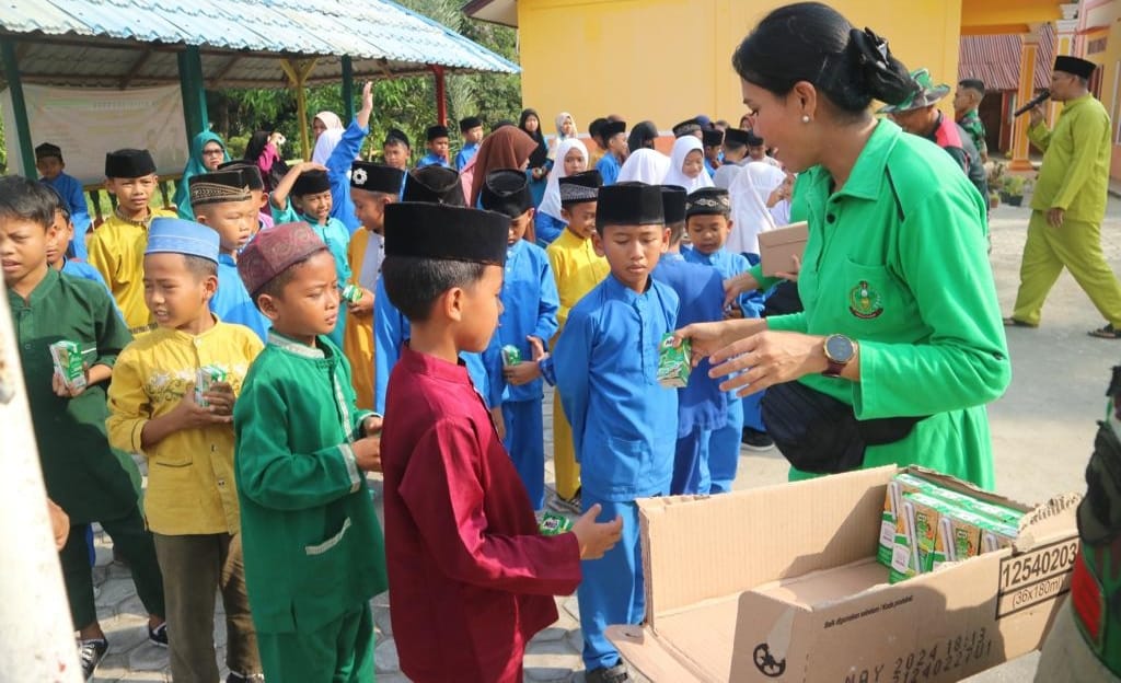Dansatgas TMMD ke-117 Kodim 0317/TBK, Letkol Inf Budianto Damanik mengajak warga Desa Lubuk Puding, Kecamatan Buru, Kabupaten Karimun, Provinsi Kepulauan Riau untuk minum susu bersama.