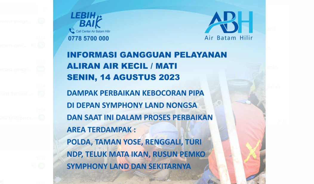 BATAM – Kepada pelanggan Air Batam Hilir, diinformasikan telah terjadi kebocoran pipa di depan Perumahan Symphony Land Nongsa dan saat ini perbaikan masih dalam proses.