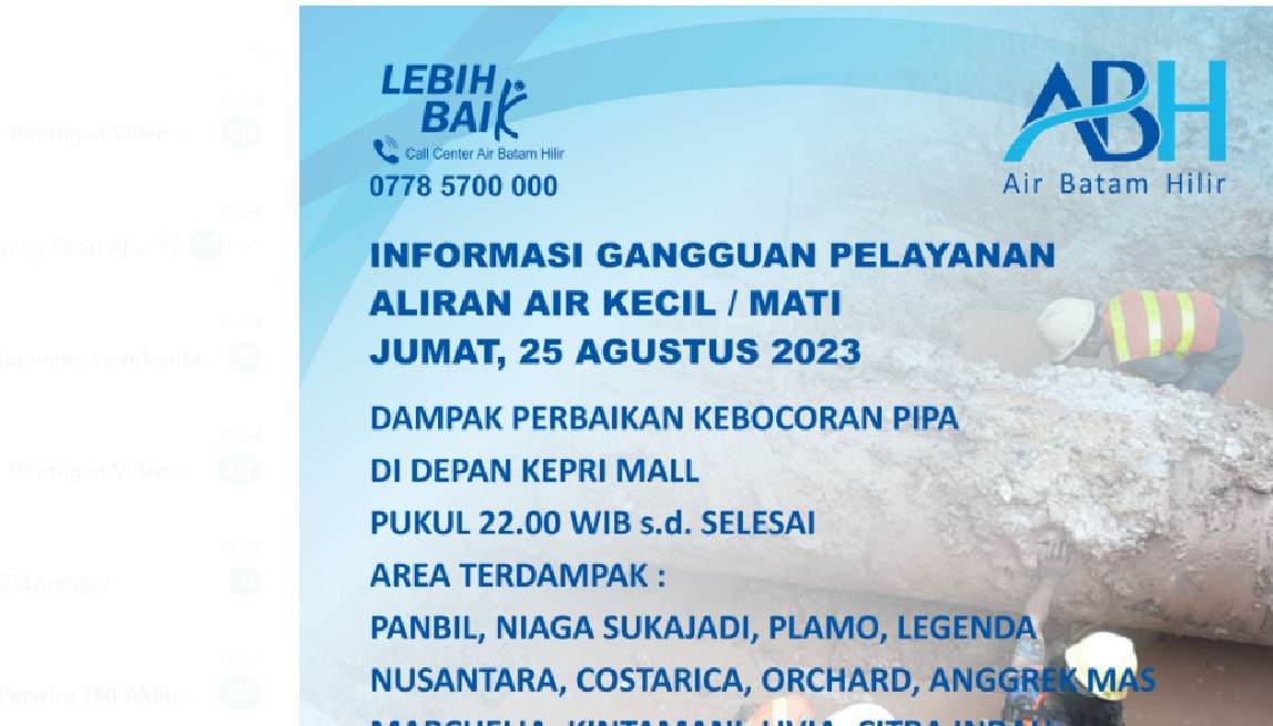 BATAM – Air Batam Hilir menginformasikan terjadi kebocoran pipa Transmisi Duriangkang-Ozon DN800 mm, akibat pekerjaan drainasi depan Central Sukajadi