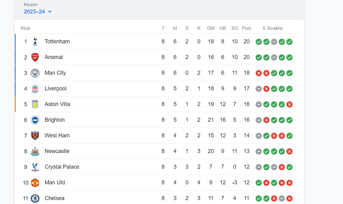 Klasemen Minggu ke 8 Liga Inggris 2023