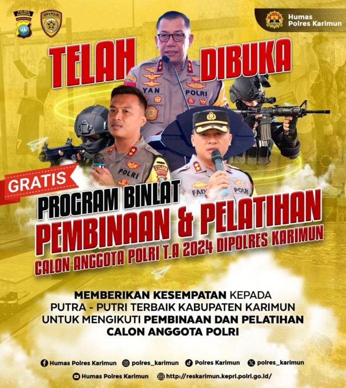 “Memberikan kesempatan kepada putra dan putri terbaik Kabupaten Karimun, untuk mengikuti pembinaan dan pelatihan calon anggota Polri,” sebut Heru, Rabu (17/1/2024).