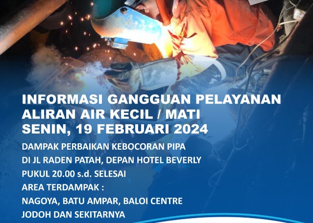 BATAM – Info Pelanggan Air Batam Hilir, bahwa Air Batam Hilir menginformasikan dampak pekerjaan perbaikan kebocoran pipa 500mm di Jalan Raden Patah, depan hotel Beverly, yang akan dilakukan pada :