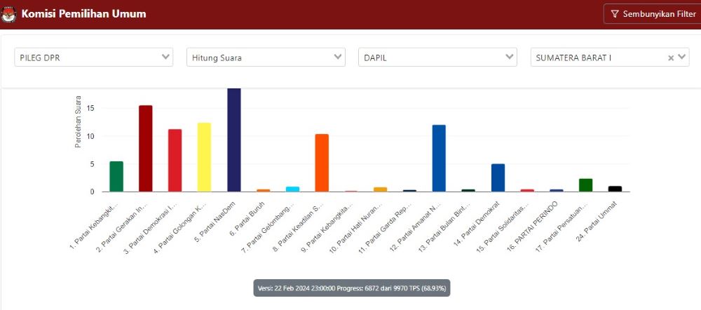 Untuk diketahui di Dapil Sumbar 1, kuota kursi DPR RI ada delapan. Dari penghitungan suara yang sudah masuk dari 6.872 TPS dari 9.970 TPS (68,93%), tujuh kursi ‘suda’ diamankan oleh enam partai.